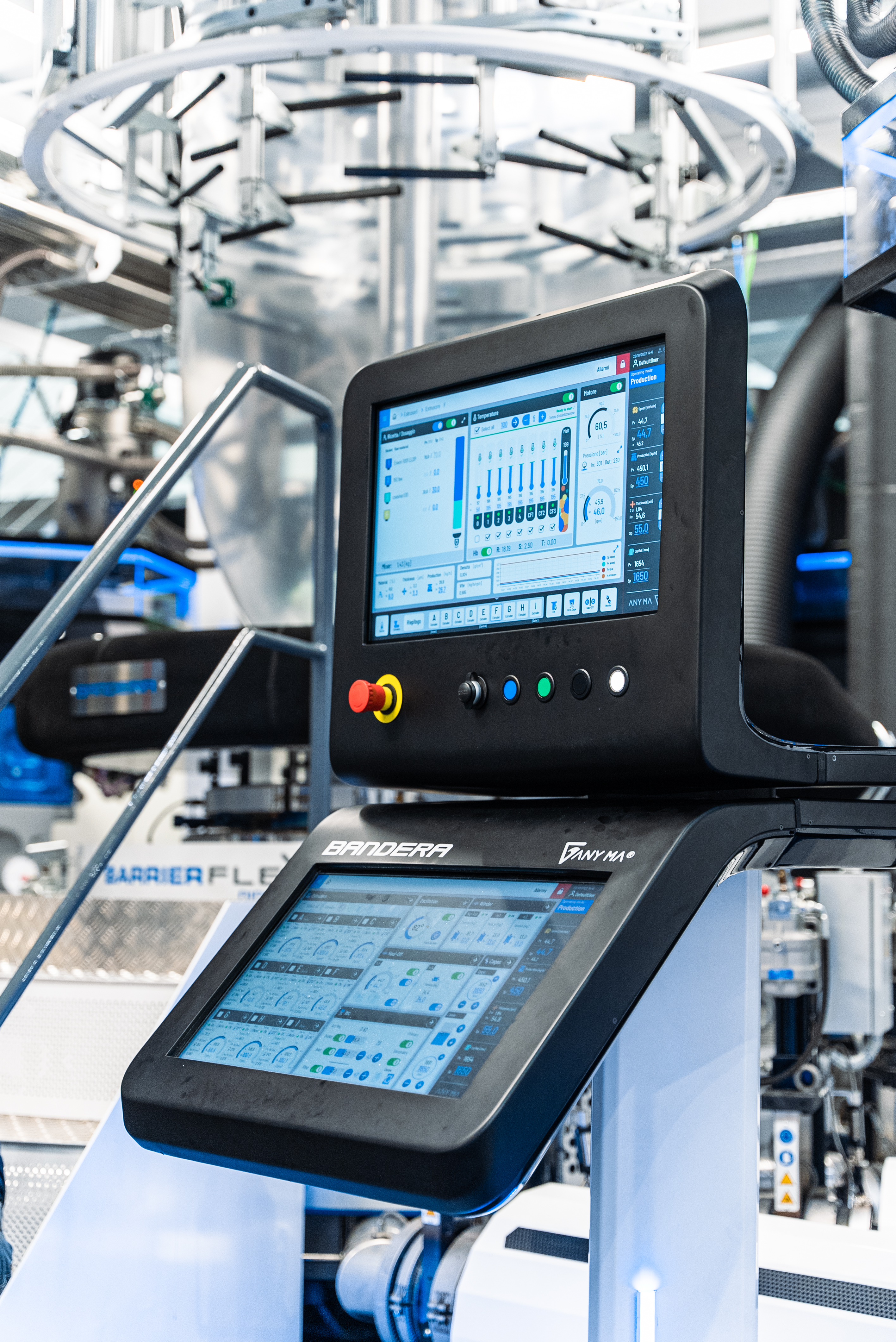 Châssis monobloc, vis de diamètre 20 à 35 mm, changeur de filtres, tête tournante, filière de 50 à 150 mm, anneau de refroidissement, guide bulle, soufflets, tirage, corona, impression en ligne, enrouleur simple ou double jusqu’à 900 mm de laize.